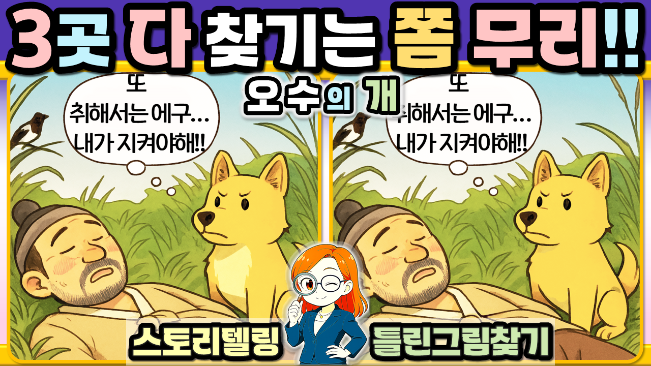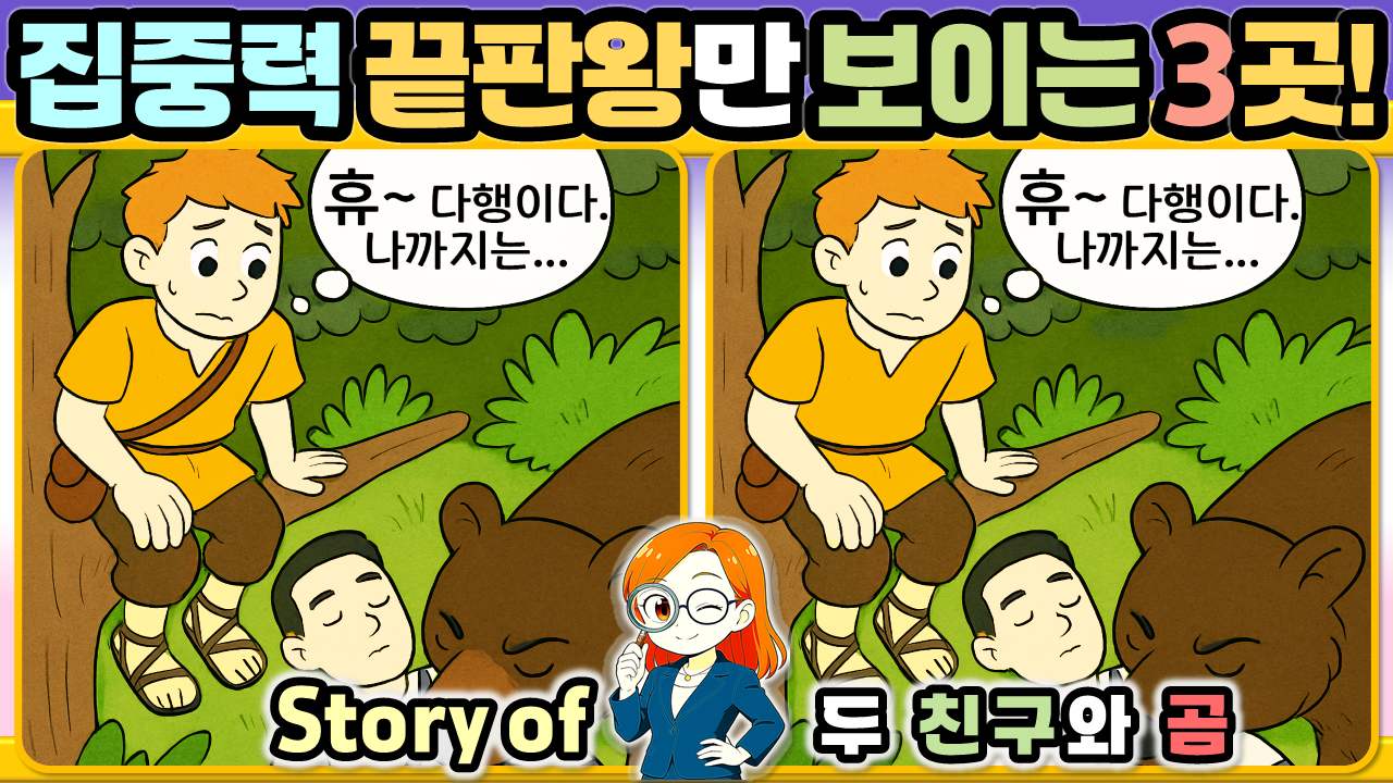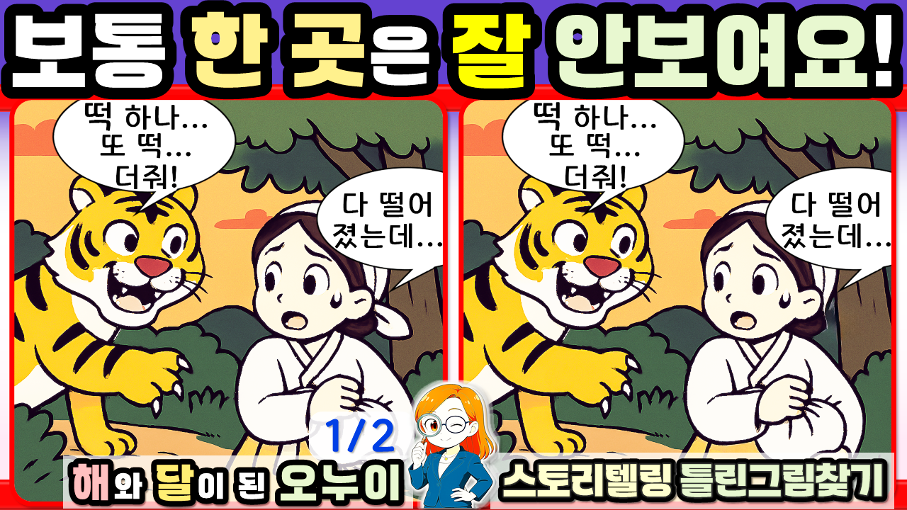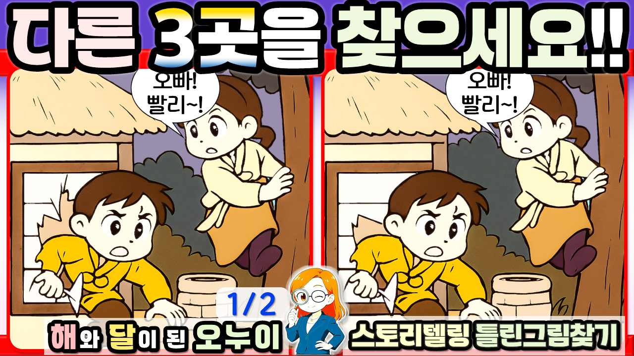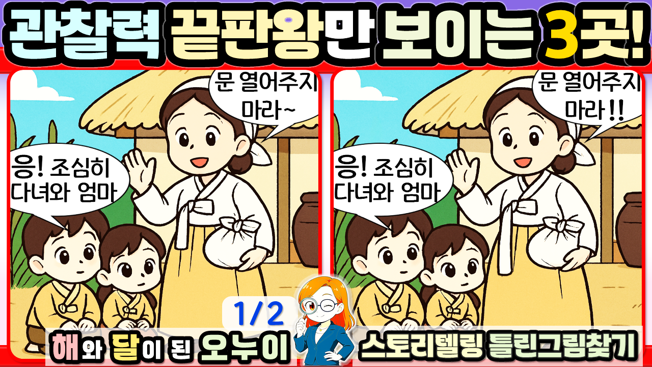 https://youtu.be/bDkQZ3s7BOo?si=GQHmZvLf6XgaB2Qa본 틀린그림찾기(다른그림찾기) 퀴즈는 한국 전래동화(구전 설화)'헤와 달이 된 오누이' 이야기의 장면들을 각색하여 만들었습니다. 이 이야기 '해님 달님'으로도 알려져있지요. 상황 및 대사는 원작과 조금 다를 수 있습니다. 재미있는 이야기와 함께 두뇌건강도 챙겨보세요.😊👍 🧠 두뇌를 깨우는 집중력 테스트! 시각과 두뇌를 동시에 활성화하고 주의력, 기억력, 사고력을 강화하세요! 이 게임은 스토리텔링 요소가 있어 어린이부터 할아버지, 할머니까지 모두 즐길 수 있어요. 🎯 틀린그림찾기의 효과 ✔ 집중력 & 주의력 향상 ✔ 시각적 기억력 증진 ✔ 추리력 & 창의력 강화 ✔ 스트레스 해소, 정서 안정 🔍 Brain Puz..